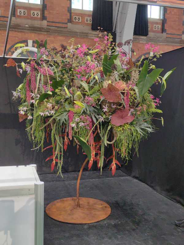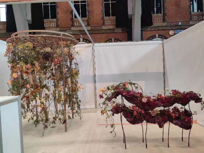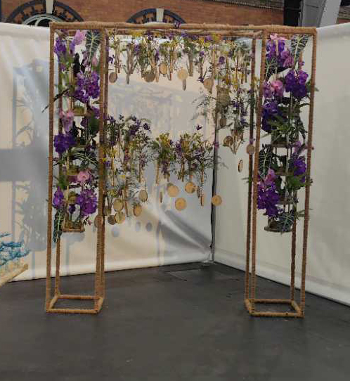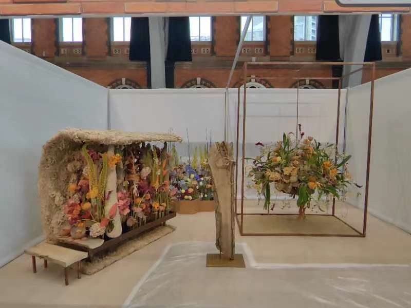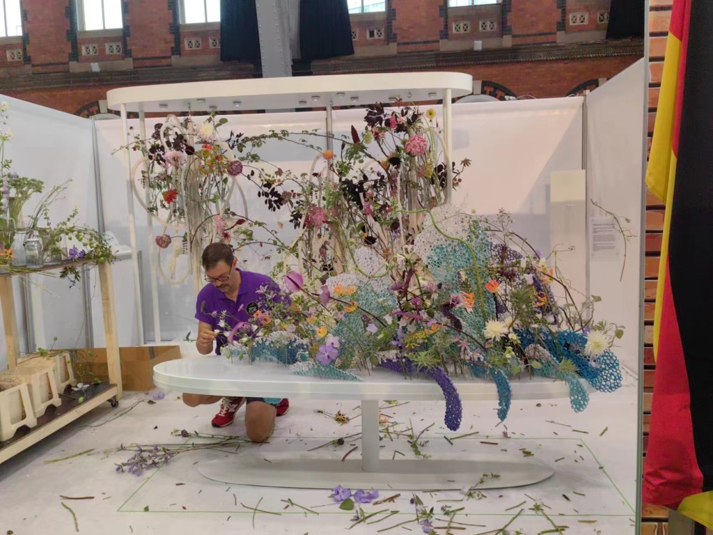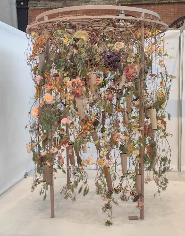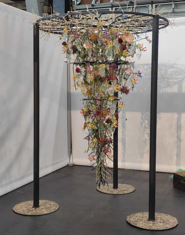 My ‘Canopy‘ is based on three pillars. The base of the structure is covered with paper in the shape of fungi. It had to be a suspended work so it actually hangs in the structure. All flowers are placed in little glass containers in the form of leaves. The person next to me is Pieter Teisman. He came all the way from China to help me.