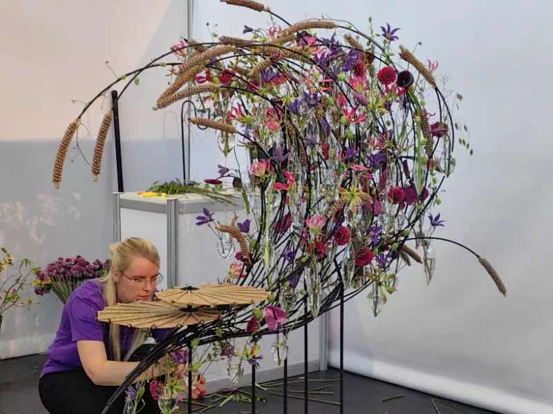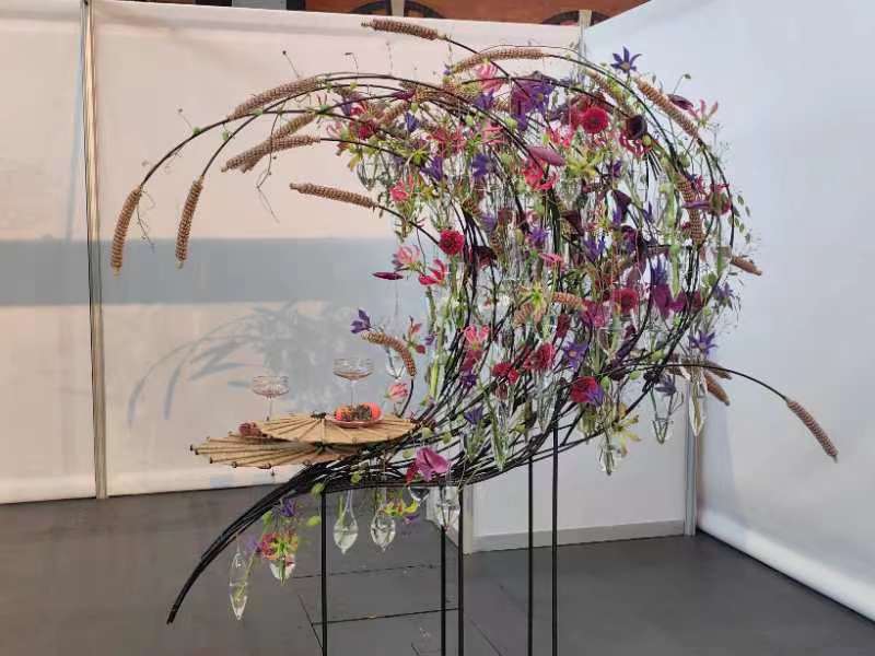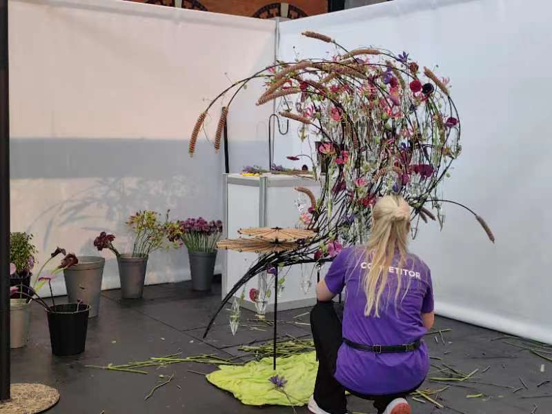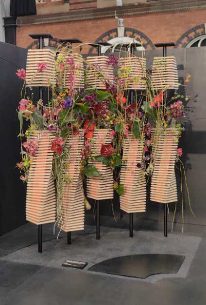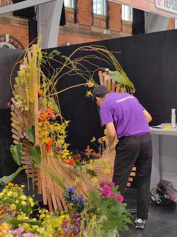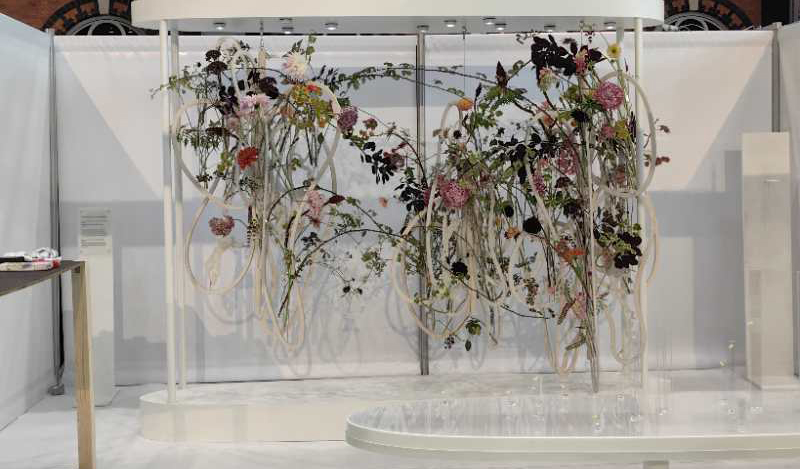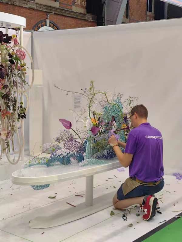 My ‘Canopy‘ is based on three pillars. The base of the structure is covered with paper in the shape of fungi. It had to be a suspended work so it actually hangs in the structure. All flowers are placed in little glass containers in the form of leaves. The person next to me is Pieter Teisman. He came all the way from China to help me.
