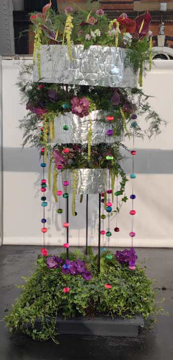 The second task was a table decoration. The theme was ‘Dancing witn the waves’. It had to be a table for two. I made two small tables of paper wire (Oasis) The ‘waves’ are made from iron. The whole construction is placed on thin ‘pillars’ that make it light.