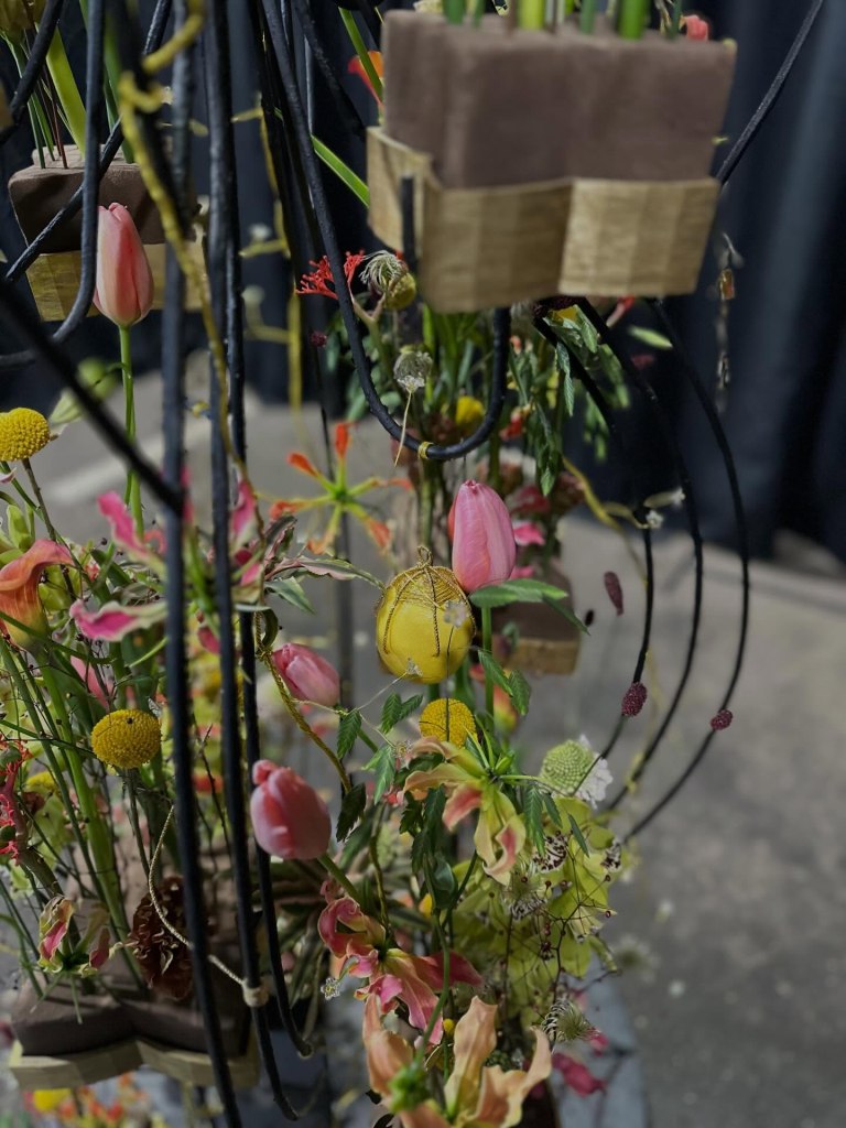 Ik heb geluk dat er sponsors zijn die bloemen beschikbaar willen stellen. En het materiaal dat ze beschikbaar stellen, is van de beste kwaliteit. Dat is voor een wedstrijd ook absoluut nodig. En naast de bloemen was Oasis sponsor: de bloemen moesten in milieuvriendelijk steekschuim worden verwerkt. Dat vraagt ook weer een bijzondere oplossing. Ik heb hiervoor ondergronden op de 3D printer laten maken, waar het steekschuim precies in past. Het steekschuim is duidelijk zichtbaar verwerkt: het is niet meer iets, dat weggestopt moet worden. In feite is het ook een decoratief element.