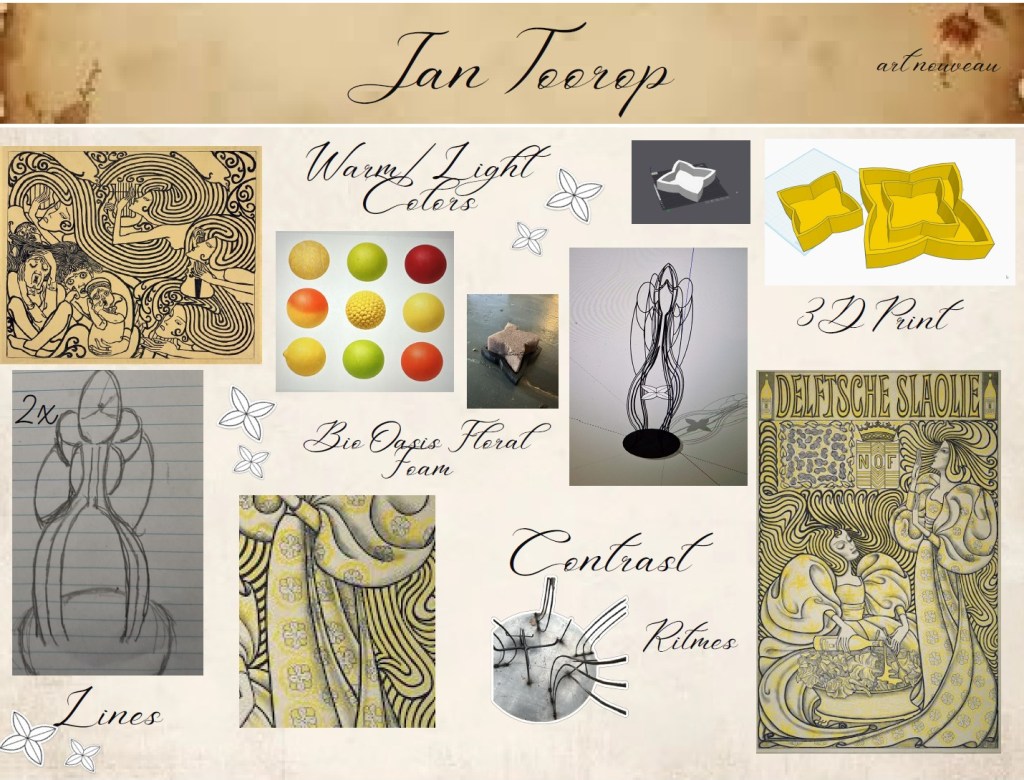 Ik heb voor deze opdracht gekozen voor Jan Toorop. De stijl, Jugendstill, spreekt mij erg aan. Dit past bij mij. Vervolgens ontwerp je een ondergrond die past bij dit thema. Mijn vader kan goed lassen, mijn oud leraar kan op de computer een tekening op maat maken, een vriend kan goed overweg met de 3D printer! Met z’n allen hebben we de ondergrond tot een eindresultaat weten te brengen. Alles binnen de maten en stabiel! Nu de bloemen.